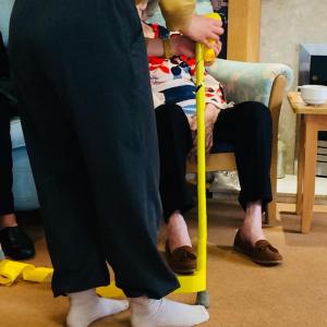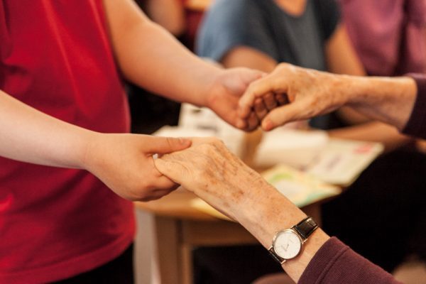 A resident sits in their chair, a child stands in front, I kneel between. I place one hand on the residents arm and the other gestures in the empty space between the resident and child. The child says their name, the resident can’t hear. The child is too far away and speaks too quietly. I usher the child forward and ask them to speak louder, show them how loud I am speaking. I encourage them to move their body forwards as they speak. The resident looks at me, says what, I can’t hear them. I repeat. The music changes, its a sing along one. The resident starts to sing, the child doesn’t know it. I take the residents hand and the child’s hand and we start to move to the beat, I gesture to the child to take the residents other hand. We begin to sway connected altogether. The residents eyes widen and light up as they focus on the child, they smile. The child shyly smiles back. After a few moments I join the hands that I have been holding of the resident and the child. I move away…