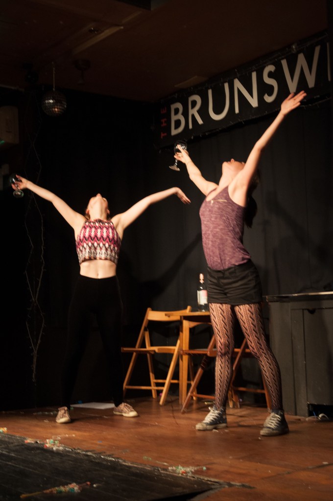 We practised on skype by timing ourselves drinking half a bottle of wine whilst marking through the choreography. It was a challenge but do-able. I was surprised, it was only rose after all. We gave ourselves a good 15 seconds at the end of the show to down whatever we had left but knew we didn’t want to rely on this by having too much to finish so it was important we spaced our drinking out accordingly. Gipping on stage was not part of the plan.