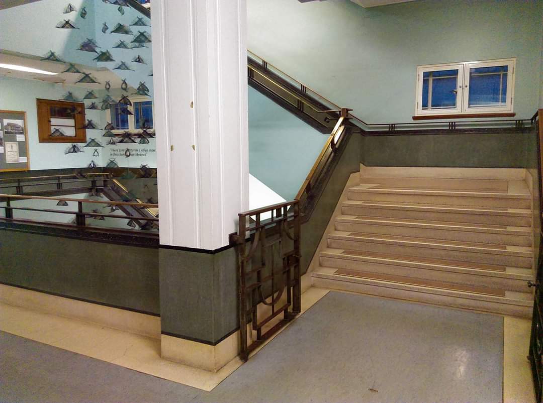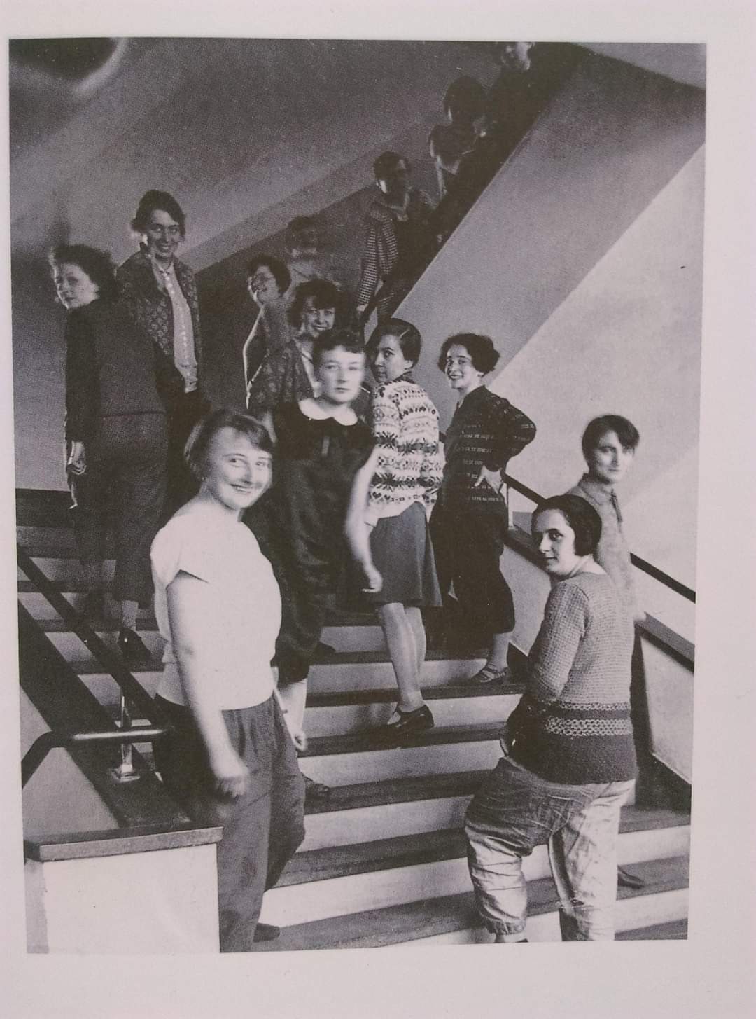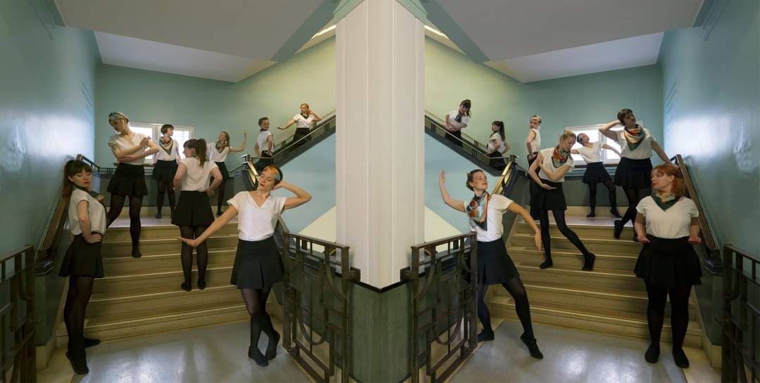 Our first pose we called ‘Weaver’s Elbow’ and is based on the painting by Oscar Schlemmer which he based on the posed photograph of the Weavers on the stairwell at the Bauhaus. A few months after the performance we gathered on the stairwell at the Sheffield Library to create a series of photos. Pulling poses from the piece, we played with spacing and angles inspired by the women on the stairs at the Bauhaus. (Allie really likes staircases, they feature a lot in her work)
