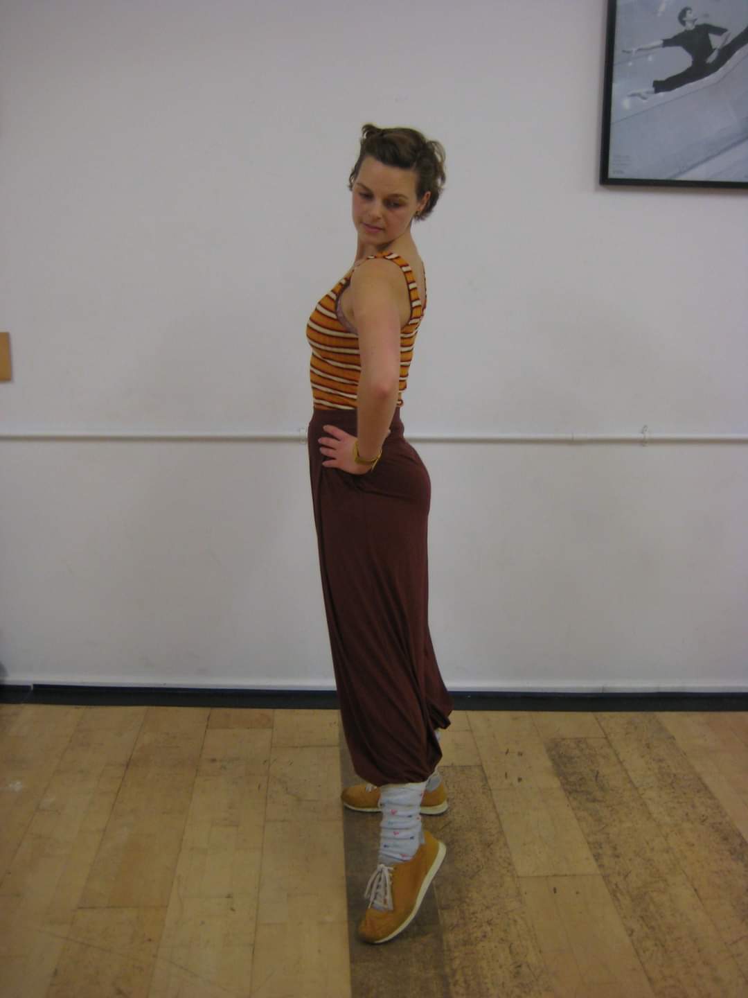 Our 5th pose ‘Sass’ was specific to and inspired by the Tiller girls kickline and chorus lines. The kicklines are fluid but also mechanical. There’s something quite caterpillar about them, the dancers moving together, each an important cog of the machine. We did an endurance kickline in the piece with me and Allie left to the end (you can see in the trailer at the end of the blog) but also deconstructed the Tiller Girls line movements and moved through them in a canon sequence to no music with me counting (video below):